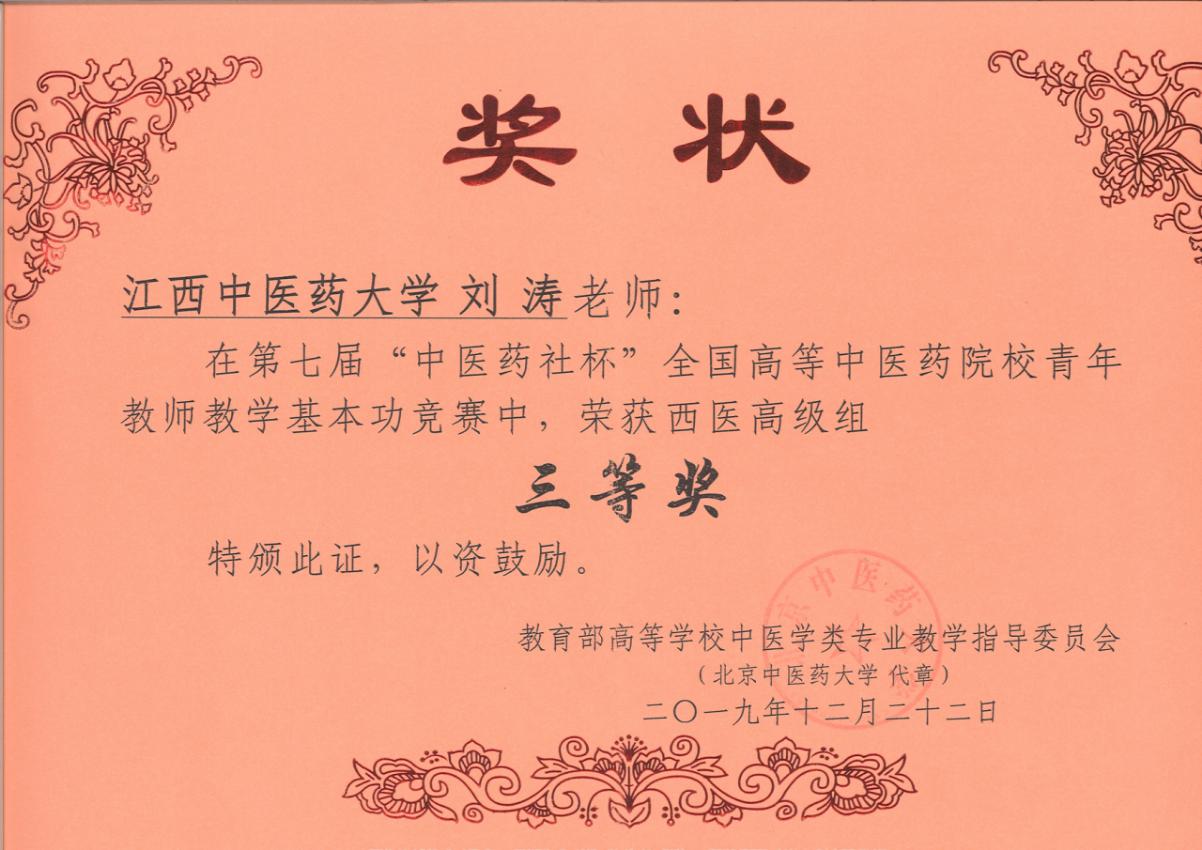 刘涛 第七届“中医药社杯”全国高等中医药院校青年教师教学基本功竞赛三等奖