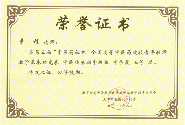 章程 第五届“中医药社杯”全国高等中医药院校青年教师教学基本功竞赛三等奖