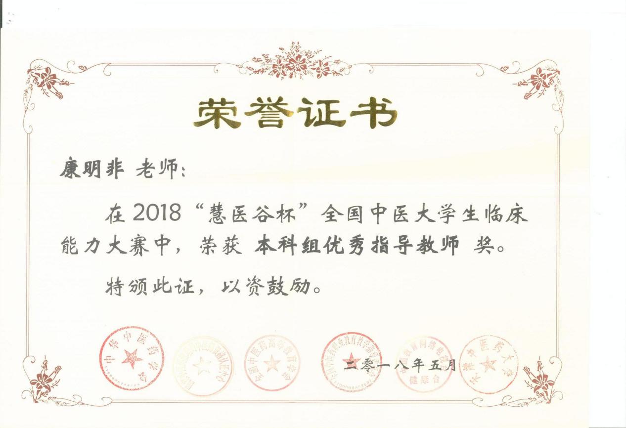 康明非 “慧医谷杯”全国中医大学生临床能力大赛优秀指导老师