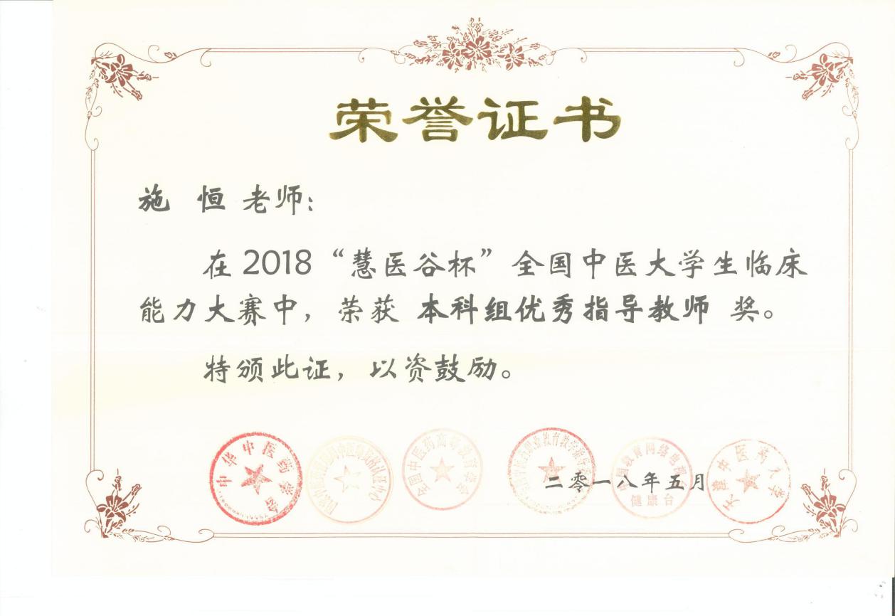 施恒 “慧医谷杯”全国中医大学生临床能力大赛优秀指导老师
