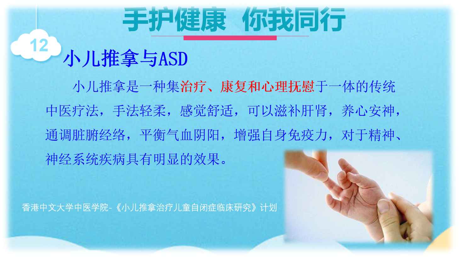小儿推拿是一种集治疗、康复和心理抚慰于一体的传统中医疗法,手法轻柔,感觉舒适,可以滋补肝肾,养心安神,通调脏腑经络,平衡气血阴阳,增强自身免疫力,对于精神、神经系统疾病具有明显的效果。相对其他干预方式,推拿疗法患儿更容易接受,治疗时也会更放松,患儿与父母的交流更自然,而愉悦、放松本身也利于自闭症的康复。大量临床研究证实,小儿推拿能有效改善自闭症儿童的临床症状,是该病早期干预、早期治疗且安全有效的治疗方法,在自闭症康复治疗中发挥着重要作用。