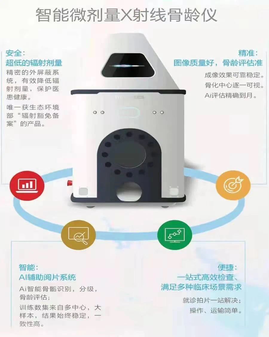 骨龄活动将使用AI智能骨龄仪测评骨龄,辐射量微小,约等于玩手机10分钟的辐射量,唯一获生态环境部“辐射豁免备案”产品。骨龄仪从拍摄到生成结果仅需1分钟,智能生成骨龄结果,让测骨龄变得和量血压一样简单。