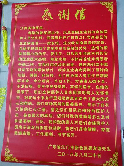 近日,家住中国陈皮之乡——广东新会的梁先生给江西中医药大学附属医院血液病科寄来了两面红彤彤的感谢锦旗和感谢信,感谢医院医护人员对他的精心诊治护理、让他重获健康!