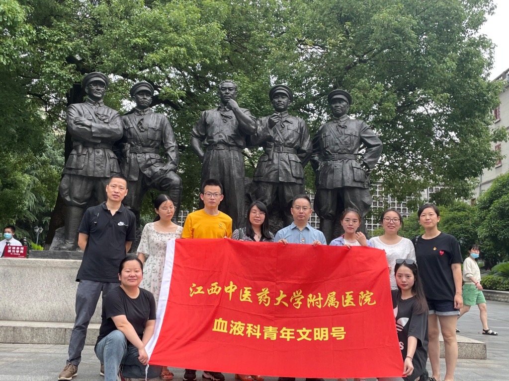 在庆祝建党100周年、迎接七一建党节来临之际,为进一步加强青年党员、团员、学生集体的思想政治教育,增强青年文明号集体对中国特色社会主义道路自信、理论自信、制度自信和文化自信,培养青年党员及团员的爱党、爱国意识,6月18日下午,江西中医药大学附属医院血液科青年文明号携手内科党总支第六党支部前往南昌八一起义纪念馆开展了以“不忘峥嵘岁月、传承革命传统”为主题的党史学习教育主题党团日活动。