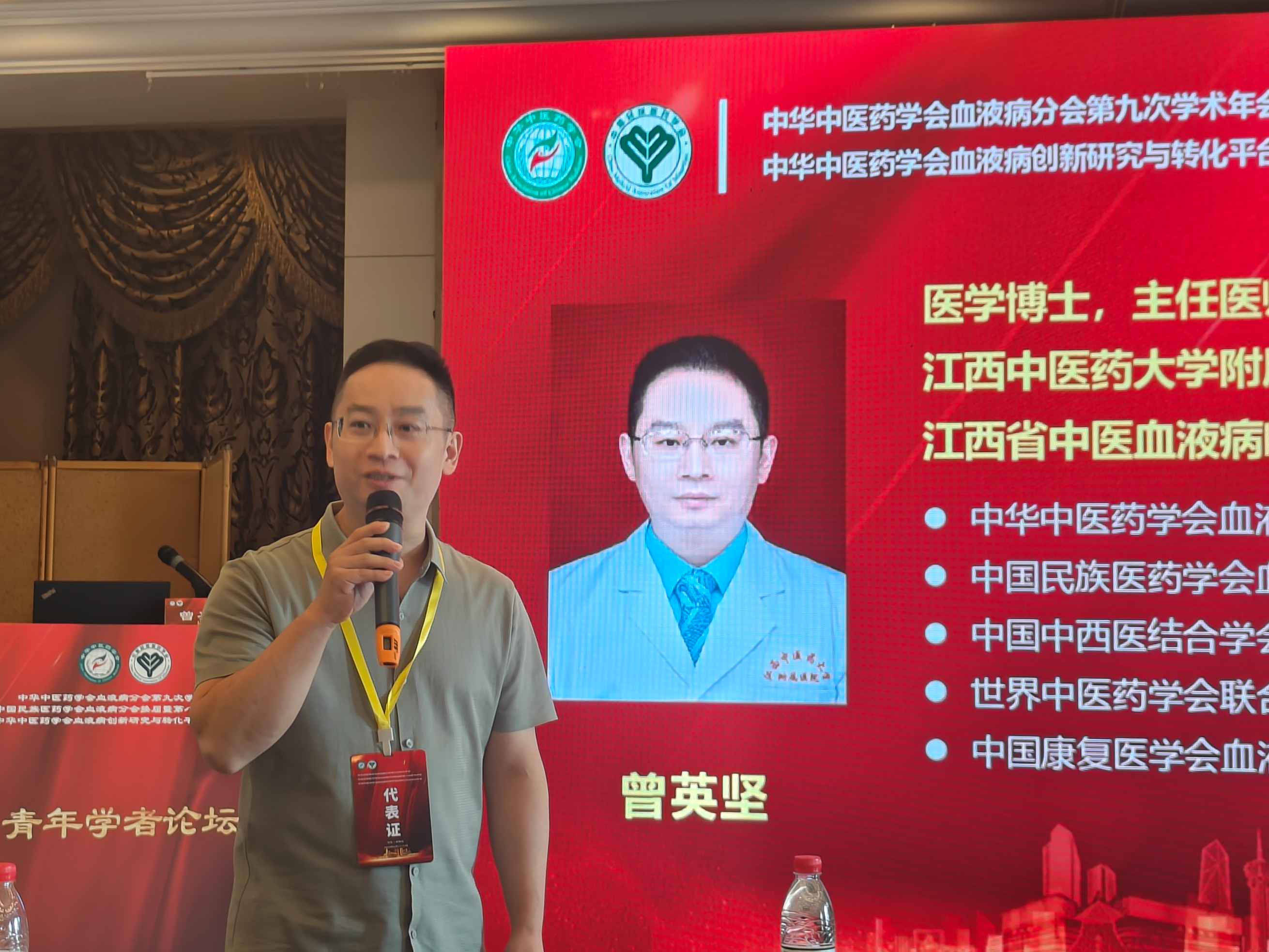 曾英坚出席中华中医药学会血液病分会第九次学术年会,并为青年论坛作总结发言 发布时间:2023-08-13点击次数:3338次 2023年8月11日至13日,江西中医药大学附属医院血液科曾英坚主任带领科室医护及博士研究生一行5人参加了在河北石家庄举办的中华中医药学会血液病分会第九次学术年会,并作为分会副主任委员为大会青年论坛作了总结性发言。
