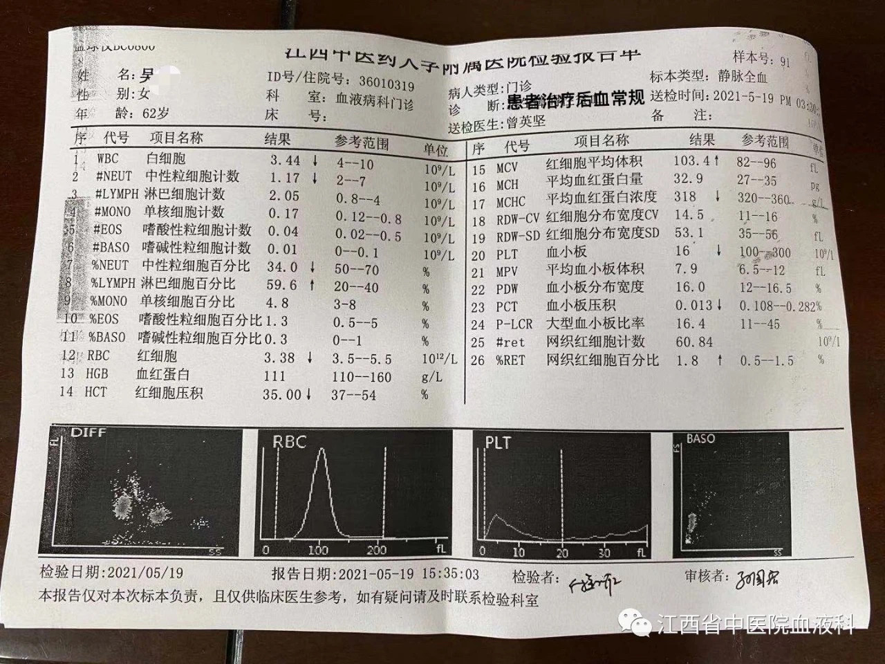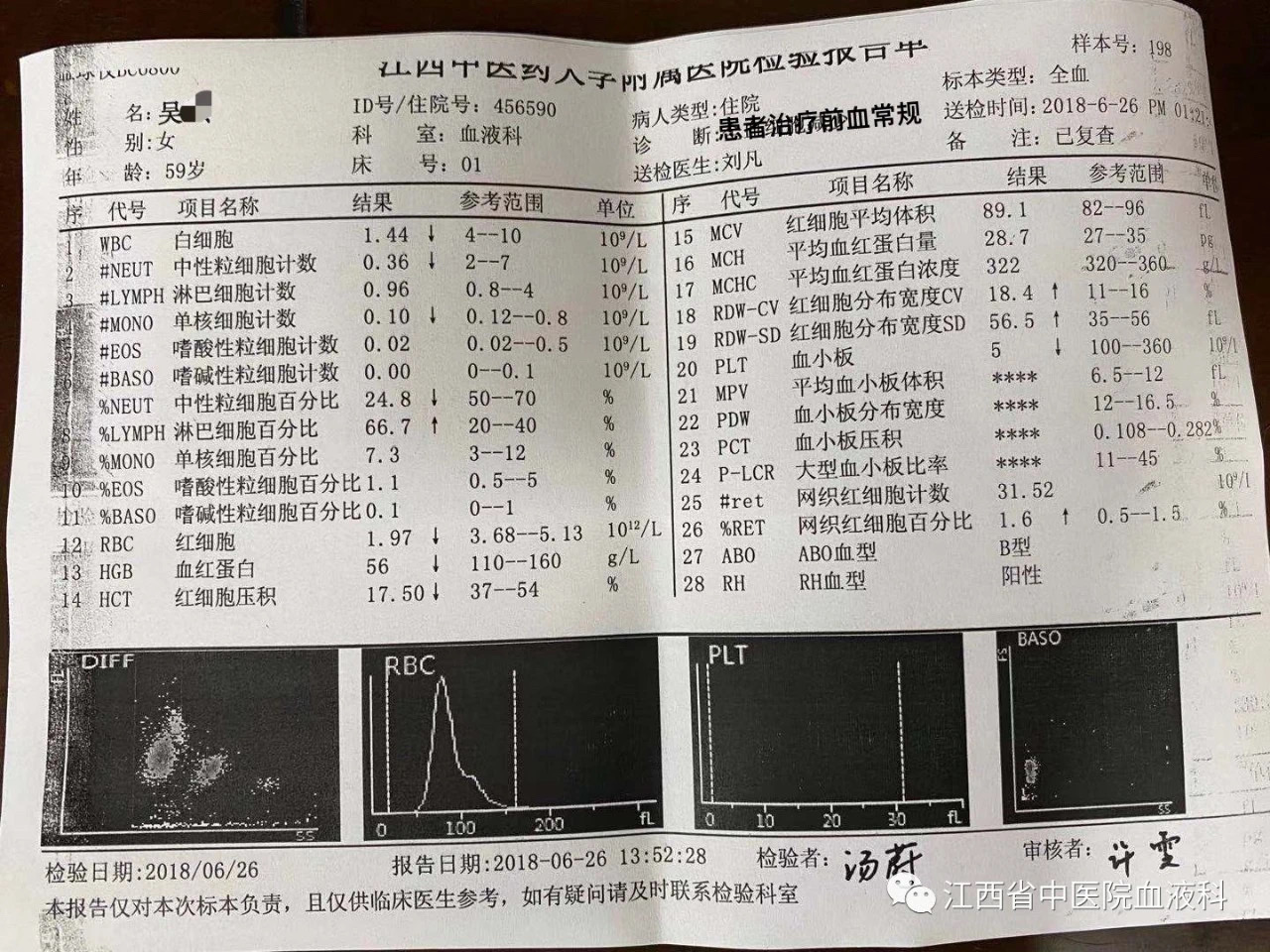 吴女士就是一位MDS患者,她于2018-6-26因“反复乏力3月余”入院,查体示贫血貌,全身散在瘀点瘀斑。入院查血常规:白细胞 1.44*109/L、中性粒细胞计数0.36*109/L、中性粒细胞百分比 24.8%、红细胞 1.97*1012/L、血红蛋白 56g/L、网织红细胞计数 31.52*109/L、血小板 5*109/L,提示全血细胞减少。骨髓穿刺行骨髓细胞学:血像:外周血成熟淋巴细胞比例升高,成熟红细胞同髓片,血小板散在少见;骨髓象:骨髓增生明显活跃,粒细胞比倒置,粒系增生稍减低,伴轻度病态改变,红系增生明显活跃,伴病态改变,全片共见巨核细胞2个,伴成熟障碍,请结合临床及骨髓活检。流式细胞免疫荧光分析:流式细胞结果提示送检标本中未检测到明显急性白血病和高危MDS相关免疫表型异常证据。高敏PNH:正常(未检测到PNH克隆)。骨髓活检:骨髓增生减低,不排除再生障碍性贫血,请结合临床、骨髓涂片及其他检查诊断∕建议必要时异位取材、追踪复查。分子病理:MDS/MPN中基因突变检测Panel(30基因)均未检测到突变。诊断:1.全血细胞减少 骨髓增生异常综合征(低增生)? 2.高血压病 3.乙型肝炎小三阳 4.2型糖尿病。患者全血细胞减少,经多家三甲医院综合评估,血液病情考虑为“骨髓增生异常综合征”,予输注红细胞、血小板等成分输血,予降糖降压、止血、抗乙肝病毒、环孢素抑制免疫、重组人促红细胞生成素促进造血等治疗。