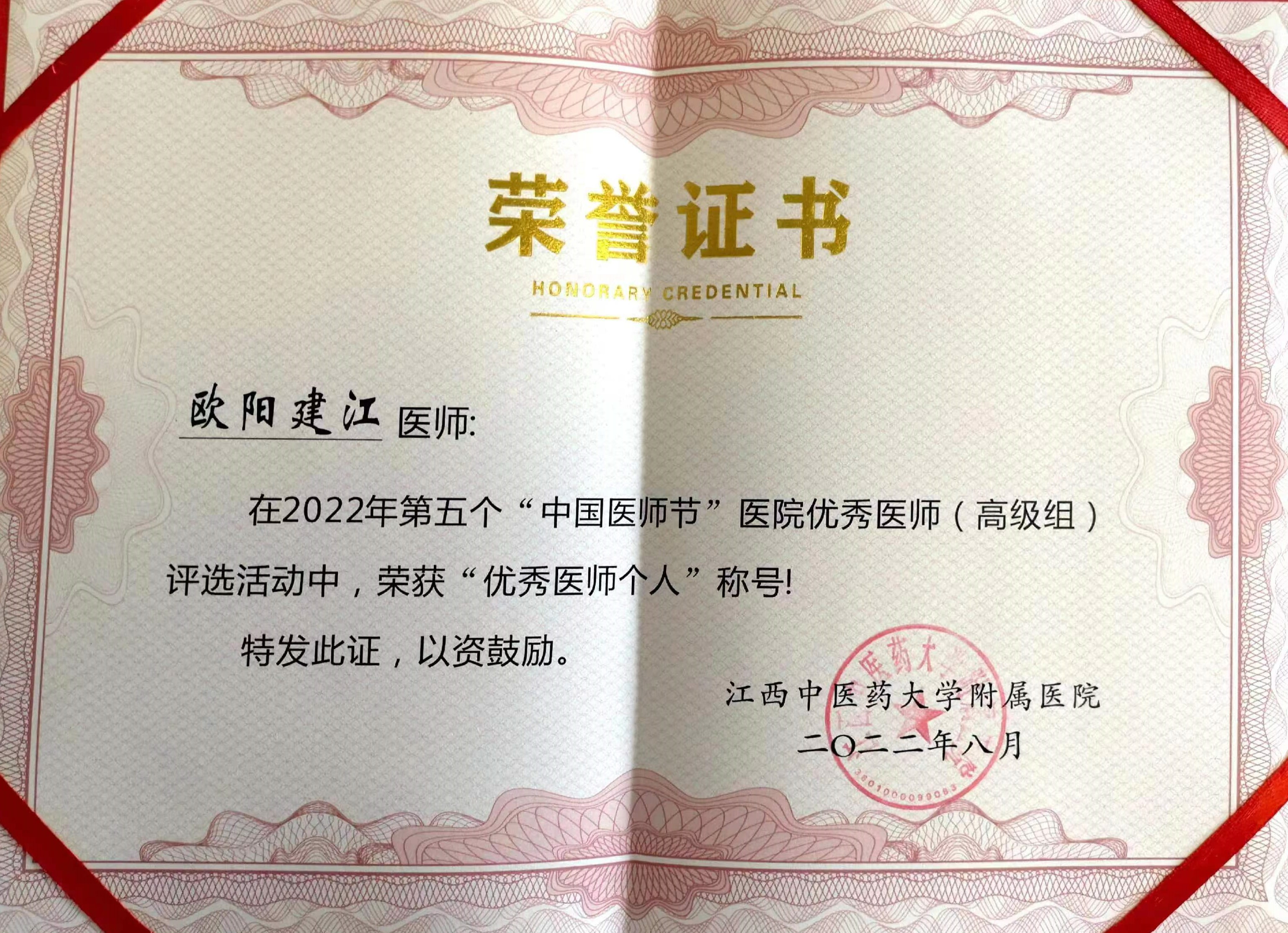 恭喜我科欧阳建江荣获“优秀医师个人”称号 发布时间:2022-09-26点击次数:16667次 2022年8月16日,江西中医药大学附属医院举行庆祝第五个中国医师节暨表彰大会,其中在“中国医师节”医院优秀医师(高级组)评选活动中,我科副主任中医师欧阳建江荣获“优秀医师个人”称号!