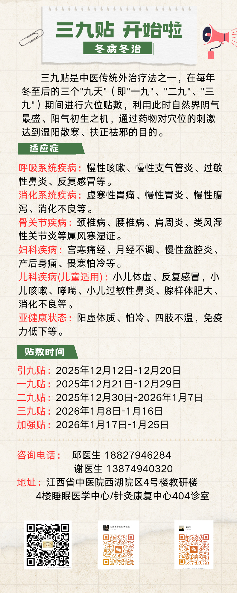 “三九补一冬,来年无病痛”。随着2025年寒冬的到来,我们又迎来了传统中医养生的重要时节——三九时节。三九贴作为中医“冬病冬治”的独特疗法,依据《黄帝内经》“春夏养阳,秋冬养阴”的理论,在一年中最寒冷的日子里,通过药物对穴位的温热刺激,温煦肺经阳气,驱散内伏寒邪。