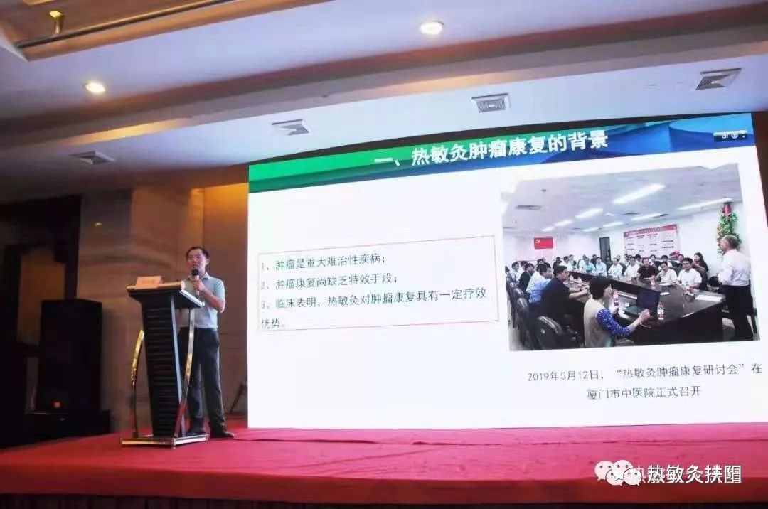 艾灸得气——2019年国家级中医药继续教育项目《热敏灸技术及其临床应用》圆满召开 发布时间:2019-07-27点击次数:6348次 7月26日,来自全国各地的200多名医务人员及热敏灸爱好者们齐聚江西南昌,在这个热敏灸诞生的地方,参加为期两天的2019年国家级中医药继续教育项目《热敏灸技术及其临床应用》学习班。 黄仙保主任带来的《热敏灸在肿瘤康复中的应用》为学员们打开了新的思路,就热敏灸如何更好的在肿瘤康复中应用,引发了学员们的热烈讨论。 恶性肿瘤是一类难治的慢性全身性疾病。目前,治疗癌症尚缺乏特效的根 治方法。临床上,通过手术、放疗和化疗,即使把肉眼能见的肿瘤完全清除,或达到完全缓解,也很难保证日后不再复发或转移。因此,每一个病人都需要后续的康复治疗。热敏灸创始人陈日新提出“阳常有余,阴常不足”的学术思想,以热敏灸温补阳气为技术核心,开创了热敏灸肿瘤康复新模式。